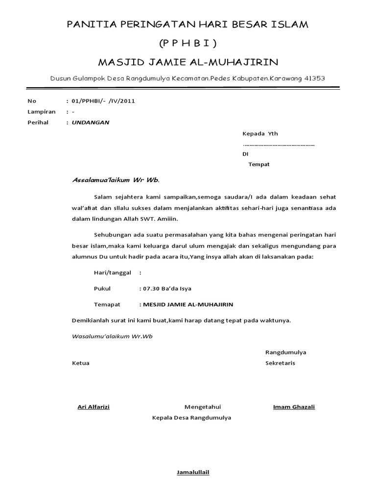 Contoh surat undangan kegiatan maulid nabi. Ada dua jenis surat undangan yaitu surat undangan tidak resmi dan resmi. Contoh surat undangan resmi mengahdiri acara dibuat dan ditujukan bisa kepada individu atau sebuah kelompok dalam perusahaan sehingga memang biasanya ketua atau kepala sekolah yang di undang tidak bisa hadir disinilah akan di ganti dengan perwakilanya. Wasalumu'alaikum wr.wb rangdumulya ketua sekretaris ari alfarizi mengetahui imam ghazali kepala desa rangdumulya jamalullail panitia peringatan hari besar islam (p p h b i. Beberapa diantaranya adalah surat undangan pengajian akbar, pengajian rutin, pengajian pernikahan, pengajian maulid nabi, pengajian umum, pengajian syukuran, dan lain.